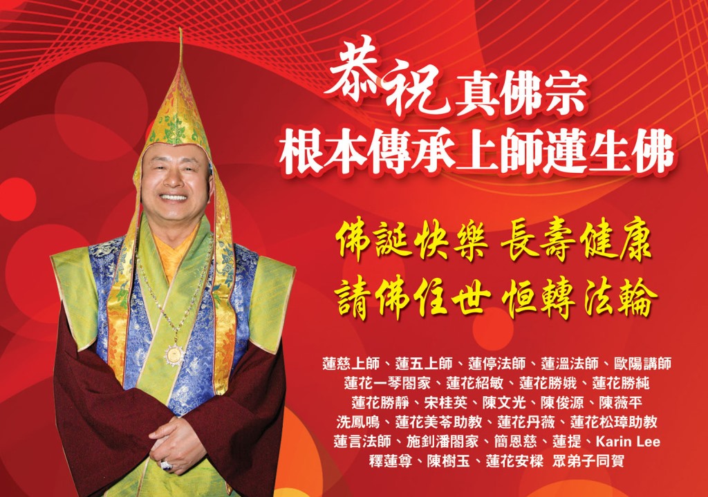 廣告刊登、焦點 恭祝 真佛宗根本傳承上師蓮生佛 20 6 月, 2019 tbnews7 恭祝 真佛宗根本傳承上師蓮生佛 佛誕快樂 長壽健康 請佛住世 恆轉法輪 蓮慈上師、蓮五上師、蓮停法師、蓮溫法師、歐陽講師、蓮花一琴閤家、蓮花紹敏、蓮花勝娥、蓮花勝純、蓮花勝靜、宋桂英、陳文光、陳俊源、陳薇平、洗鳳鳴、蓮花美苓助教、蓮花丹薇、蓮花松璋助教、蓮言法師、施釗潘閤家、簡恩慈、蓮提、Karin Lee、釋蓮尊、陳樹玉、蓮花安樑眾弟子同賀