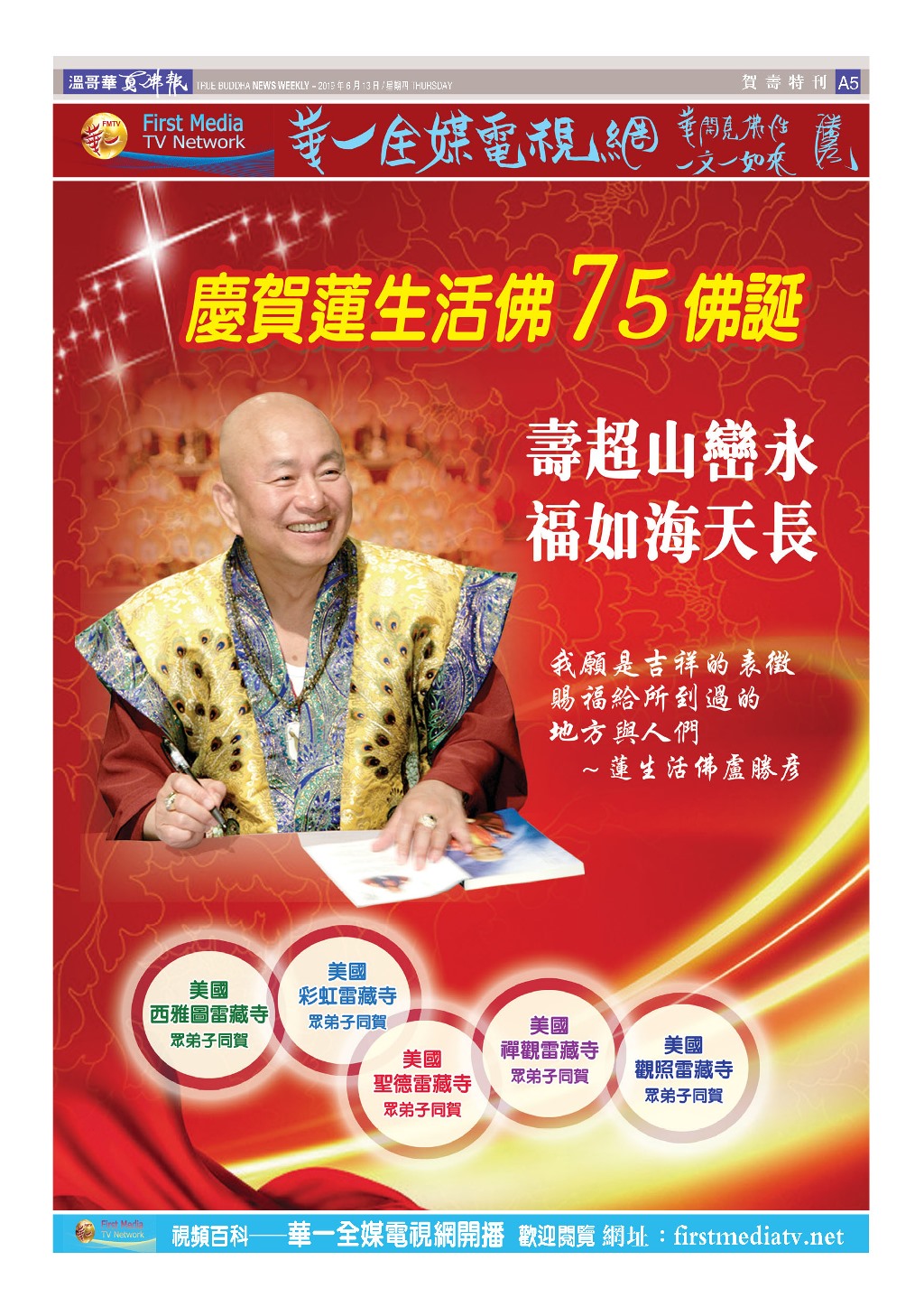 廣告刊登、焦點 慶賀蓮生活佛75佛誕 14 6 月, 2019 tbnews7 壽超山巒永 福如海天長 我願是吉祥的表徵 賜福給所到過的地方與人們 ~蓮生活佛盧勝彥 美國 西雅圖雷藏寺 彩虹雷藏寺 禪觀雷藏寺 觀照雷藏寺 聖德雷藏寺 眾弟子同賀