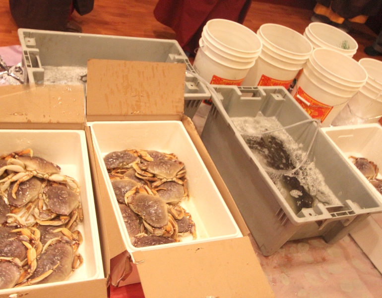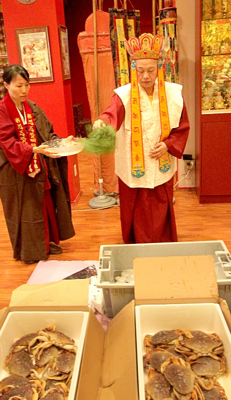 放生法會後,蓮慈上師開示時談到此次放生法會的緣起:「法會前一天,帶外地來掛單的同門師兄姐去參觀溫哥華著名的地標和海景──五帆大旅店。記得很多年前去的時候,沒什麼人,非常安靜,我們經常在那裡散步、玩遊戲,但這一次去卻人山人海,本來是要帶同門去看海景,結果根本看不到,因為還有一艘一樣長一樣大的白色真人版郵輪停在旁邊,也有五個帆,從下向上看,不知道有多少層,這是迄今為止我們見過的世界最大的郵輪。這只巨無霸大郵輪將整個海景全遮住,我們從五帆建築沿甲板一直走,走到腿軟,終於走到快船尾,可以看一下海景了,結果船尾那邊又有二艘郵輪,就是我們平常看到的去阿拉斯加的那種郵輪,平時單獨看的時候覺得很大,但現在看來,這二艘郵輪等於是那艘巨無霸上的救生艇一樣,令我們嘆為奇有,大開眼界。怪不得今天人這麼多,原來是三艘船上的遊客統統下來,人潮一直旺到附近煤氣鎮的街上。而且街上新增加了很多店鋪和小吃,許多街頭藝人也聚集在此,其中有銅人的水晶球表演一點都不輸於專業藝術家。無論大人小孩、貧富貴濺,也無論投多少錢幣,一個銅板都可以迎得扮銅人的藝人賣力的演出,相當敬業。還有個年輕的女孩子,大熱天脖子上圍了一條白色的圍巾,向遊客說,可以讓遊客摸,原來那是一條蛇!但是我們誰都不敢上前。巧的是,我們結束觀賞時,三艘郵輪也都離開了。」