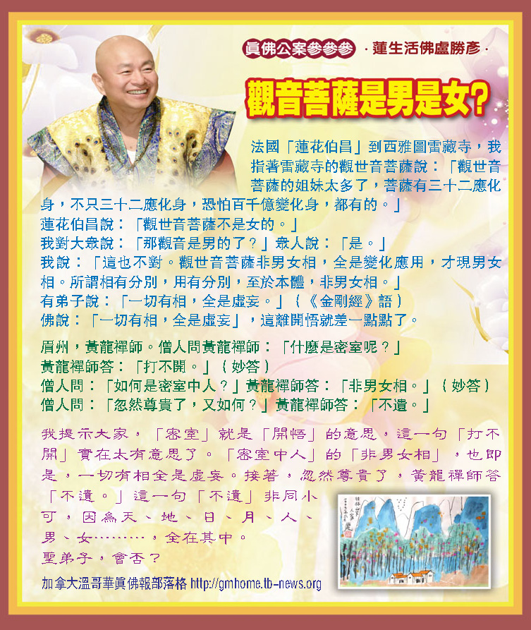 「這也不對。觀世音菩薩非男女相,全是變化應用,才現男女相。所謂相有分別,用有分別,至於本體,非男女相。」