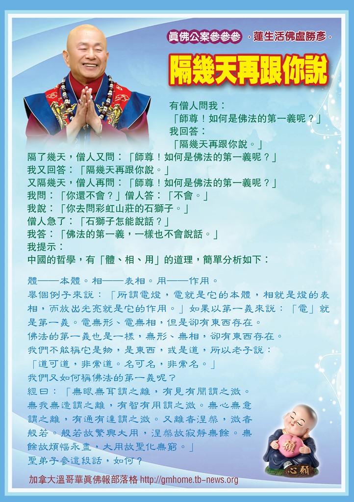 「所謂電燈,電就是它的本體,相就是燈的表相,而放出光亮就是它的作用。」